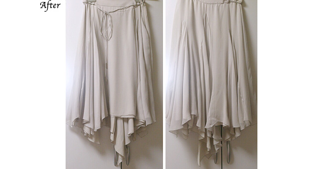 シフォンでも甘すぎないライトグレーの色味と裾の変形ヘムライン、そしてこのシルクシフォンならではのボリュームがお気に入りのスカートでした。ベルト下に曲線の切り替えがあり、はぎ方も複雑…