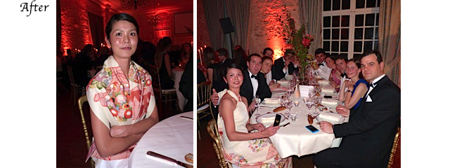 他のドレスの方以上に着物がもつ独特の雰囲気、印象、デザイン、柄は他のどんなドレスよりも目立っていました。同じ着物からショールも作っていただいたのでショールを巻くとまたまた豪華に。