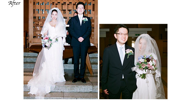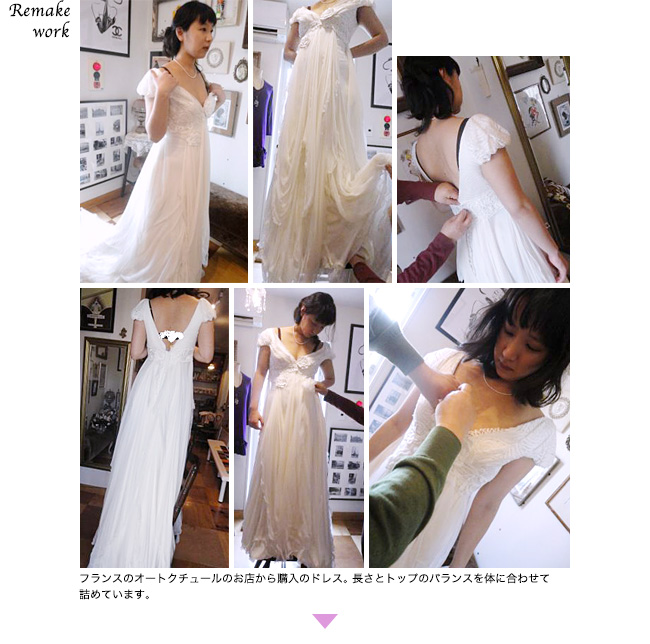 ドレスはフランスへの旅行の際に、ふと立ち寄った素敵なオートクチュールのお店に一点だけあった完成されたドレスを販売してもらったもの。