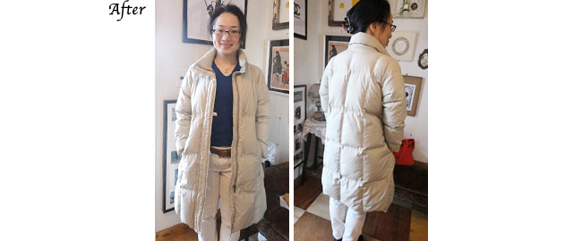 もらいものでサイズが一回り大きかったダウンコートも、肩や腕周りを直していただき、すっきりと着られるようになりました。