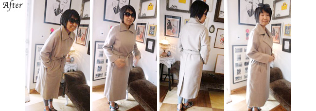 調整していただいて着てみるとびっくりしました。気になっていた箇所が解消され、洗練されたシルエットが出来上がっていました。ロンドンの冬は寒いので、長さは残しておくということに仕上げてもらいましたがそちらも大正解でした。