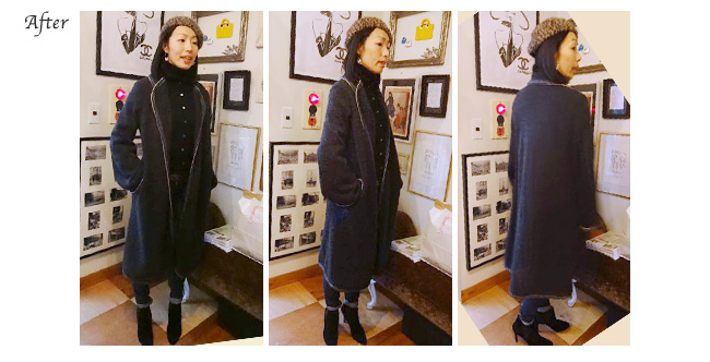 この度はニットコートを本当にステキに仕上げてくれてありがとう。 こうして服が生き返るって素晴らしいことだよね。 純ちゃんや職人さんたちの職人魂がこもった仕事を尊敬します! またお茶菓子持ってお店に遊びにいきます!! それではステキな年末年始をお過ごしくださいませ! いつもどうもありがとう!!!