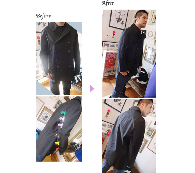 マッキントッシュのコートの直しはどのお店でも断られてしまい、せっかく頂いたのに着れずに終わってしまうのか…。と諦めておりました時に、お直しを引き受けていただいた時には本当に嬉しい思いでした。また、自分に似合うフィッティングを提案していただき重ねてありがとうございました。