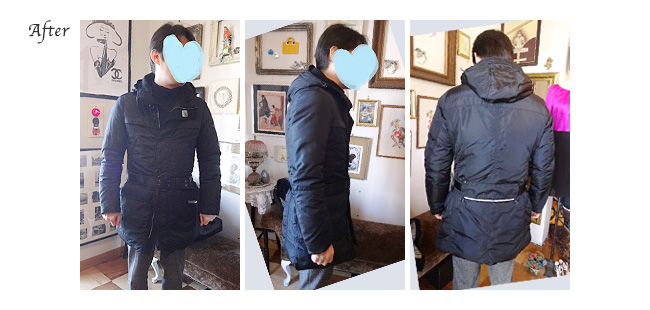 今回は直しメニューをフル動員してご対応頂きましたので、それなりの価格となりましたが満足のいく商品を着ることのできるこの喜びには代えられません。大満足です。(逆に、(パターン)オーダーメイドでピューテリーのダウンを作ったと思うと格安かも)