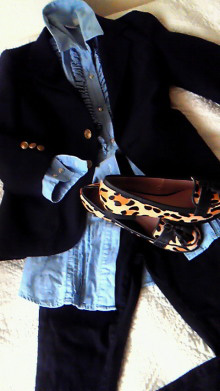 打ち合わせの日。紺ブレを久しぶりに着てみたくなりましたが、あえて気軽に羽織るように着たいなと思ったので、デニムシャツでラフにあわせました。 パンツはかなりタイトなシルエットなのでレギンスのようにはけるパンツです。 こんなとき、あえてヒールではなくて、ローファーでインパクトを足元にもってきて、 (柄プラス)遊び心をプラス。小物でインパクトが今回のポイント。